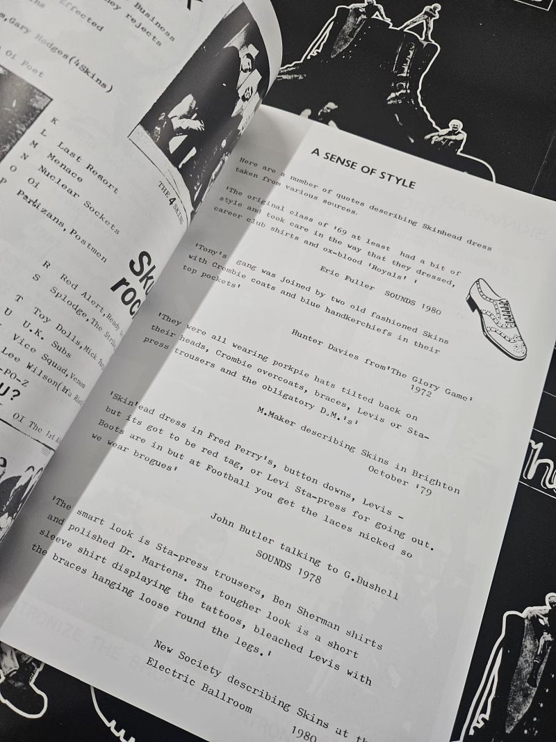 Herausgegeben von der ikonischen Londoner Boutique The Last Resort, die nicht nur Laden, sondern Treffpunkt und Herzstück der Skinhead-Szene war. In der Petticoat Lane (Goulston Street) entstanden dort fünf Ausgaben des Fanzines Skins, randvoll mit Musik-News, Stilfragen, Porträts von Szenegrößen und markanten Illustrationen.