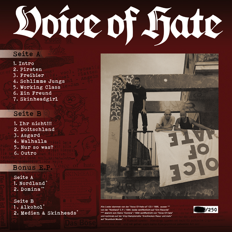 Voice Of Hate waren ähnlich umstritten wie die Rabauken Ihrerzeit, traten jedoch vermehrt mit Bands wie Smegma, Bierpatrioten, Kiezgesocks und Co. auf und liessen sich vor keinen politischen Karren spannen!