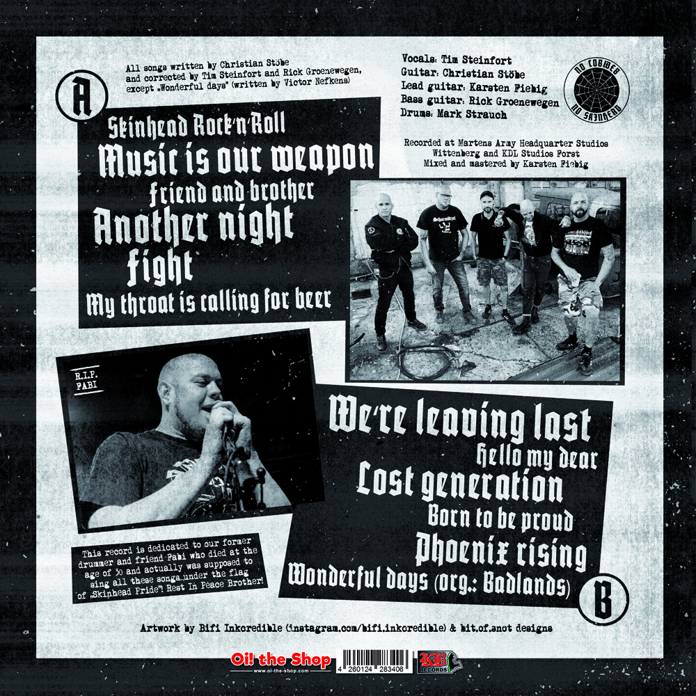 Die Lieder reichen von schnellen melodischen Hymnen wie „Skinhead Rock´n´Roll“ über eher szeneuntypischen aber dennoch grandiosem Rock a la ACDC („My throat is calling for beer“) bis hin zu eher ruhigen Nummers wie „Phoenix rising“, welche auch dem härtesten Kerl die Tränen in die Augen treiben können.